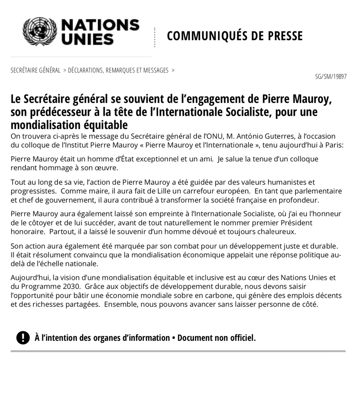 El viernes 31 de enero de 2020, el Instituto Pierre Mauroy organizó un simposio en el Senado en Francia, bajo el título: "Pierre Mauroy ou la passion de l'Internationale" en honor al compromiso de Mauroy con los asuntos internacionales. El Secretario General de la Internacional Socialista Luis Ayala, quien fue uno de los expositores invitados al evento, destacó la importante contribución que desempeñó Pierre Mauroy en política internacional y en particular su papel en el seno de la Internacional Socialista, primero como uno de sus Vicepresidentes y luego como su Presidente. Relató que uno de sus primeros encuentros con Mauroy tuvo lugar en su país natal de Chile cuando el país estaba aún bajo la dictadura militar, y comentó sobre el activo compromiso de Mauroy a lo largo de su vida con los principios y valores de la familia política socialdemócrata global.